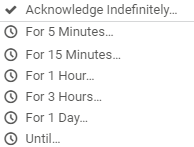 You can select Acknowledge Indefinitely, or you can acknowledge the alarm For 5 Minutes, For 15 Minutes, For 1 Hour, For 3 Hours, For 1 Day, or Until a specific time. If you select Until, you can additionally define a time period. Use the date time picker to enter the date and time. If the alarm condition still exists after this time period, the sensor shows the Down status again.