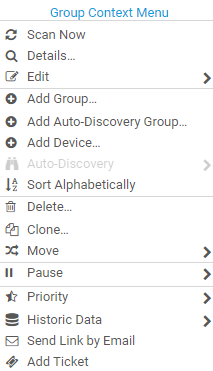 • Run Auto-Discovery: Immediately start a search to automatically add new devices and sensors to the group. The search runs in the background and uses the options you set for the Auto-Discovery Level in the group settings under Auto-Discovery Settings. If there are new devices and sensors, you see them after a few minutes.