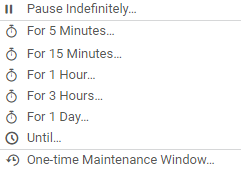 • You can also set up a One-time Maintenance Window to automatically pause the object at a specified time. In the dialog that appears, define the start and end date of the maintenance window. Use the date time picker to enter the date and time.