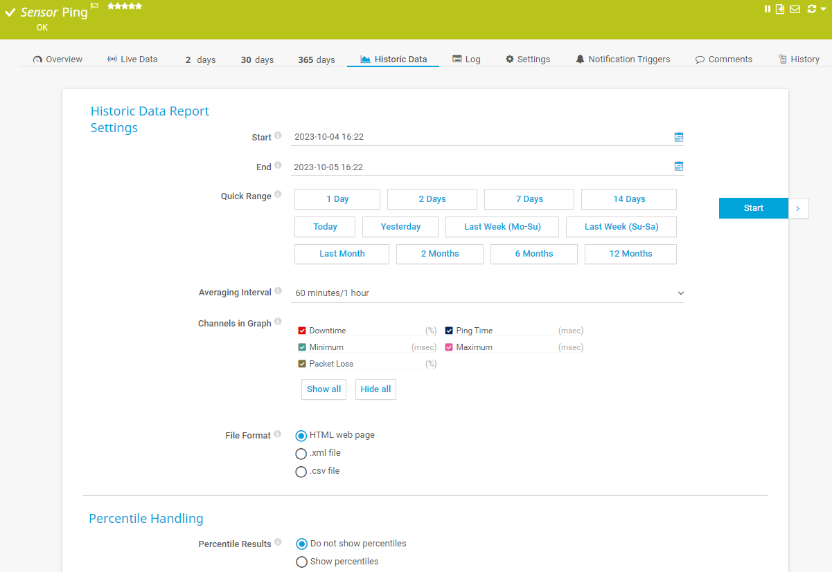 Do not show percentiles: PRTG does not use a percentile formula to calculate your monitoring results. It only shows the standard values.