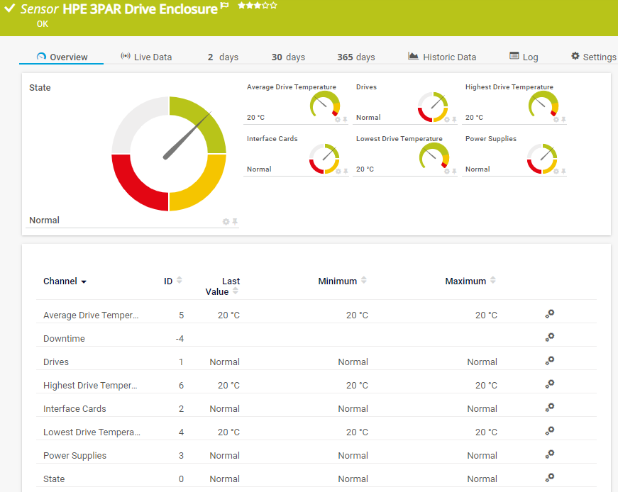 In the channel table on the Overview tab, this channel never shows any values. PRTG uses this channel in graphs and reports to show the amount of time in which the sensor was in the Down state