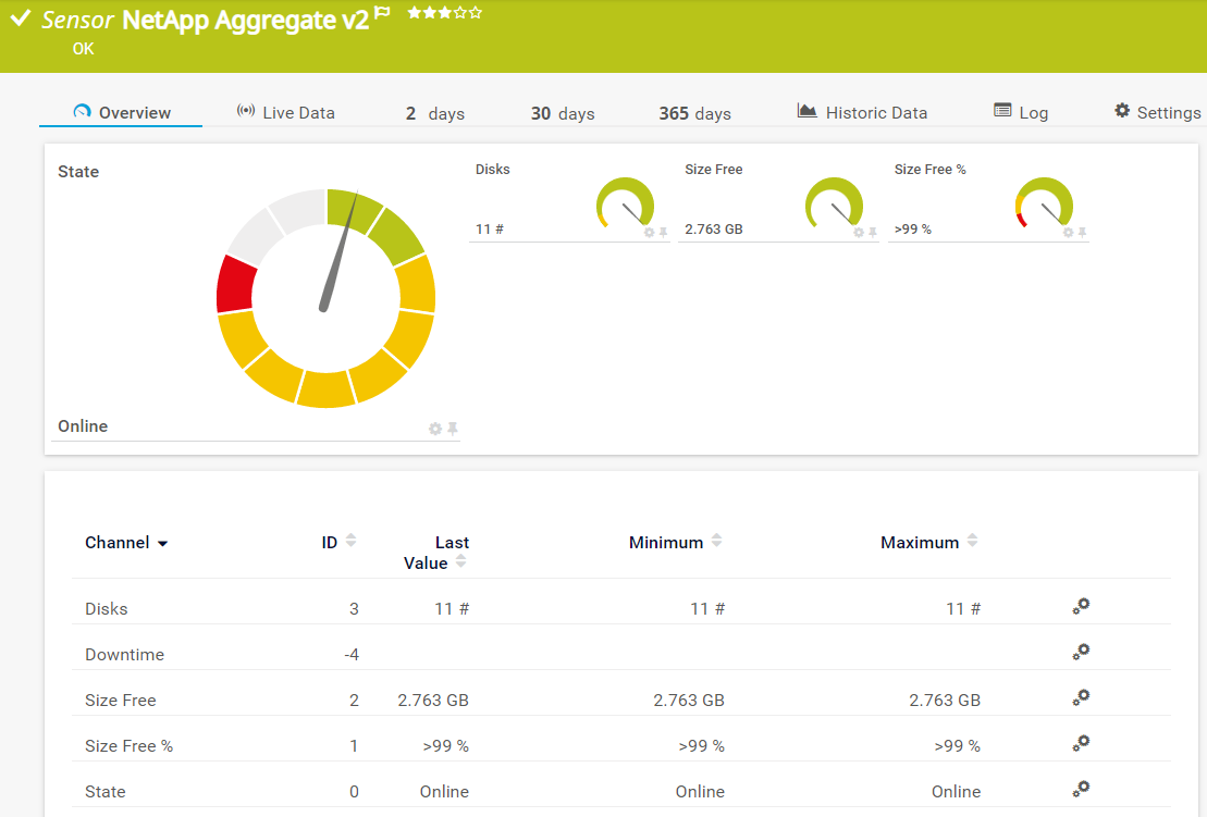 The NetApp Aggregate v2 sensor monitors the status of a NetApp storage aggregate via the Representational State Transfer (REST) application programming interface (API) using ONTAP as of version 9.6.