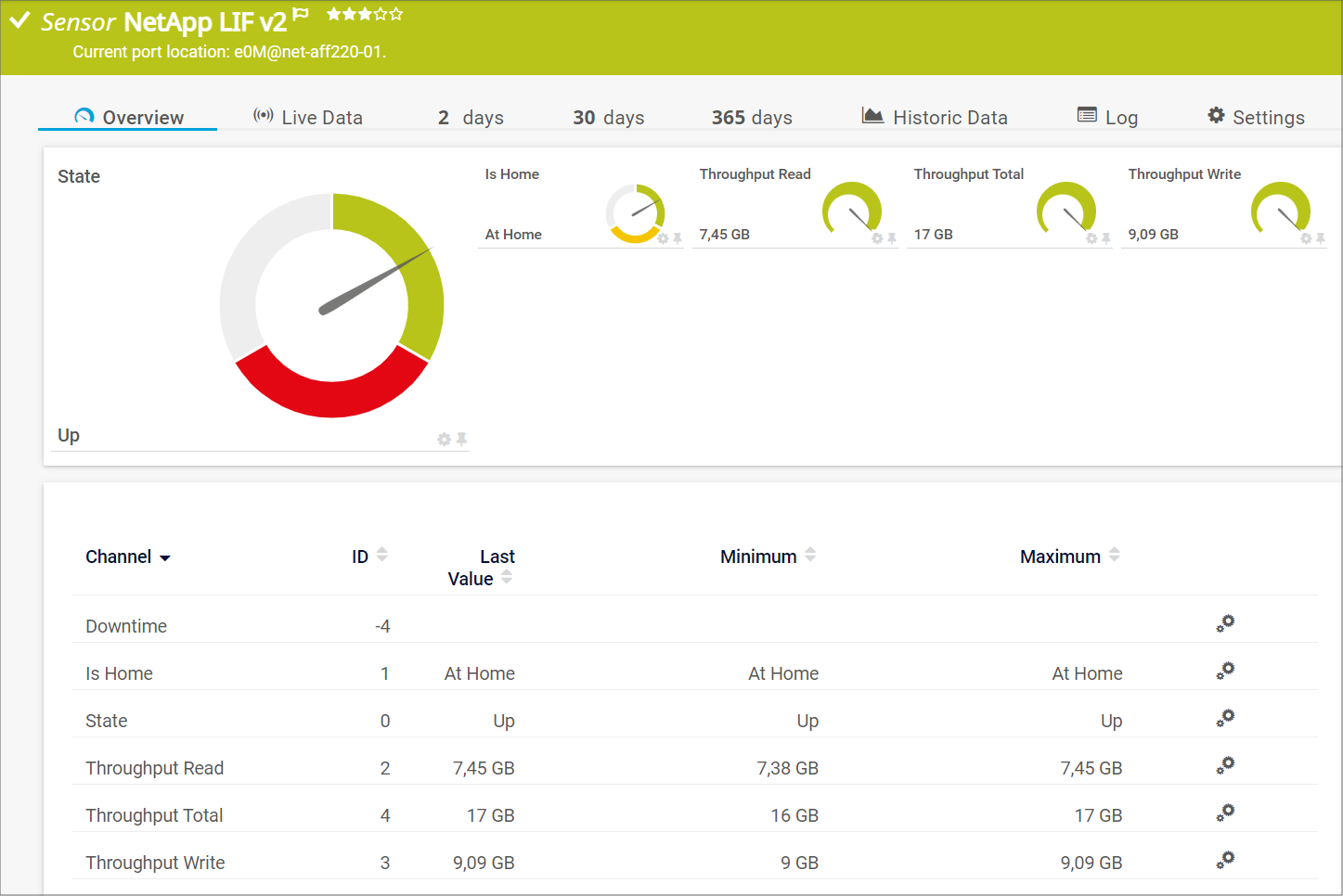 The NetApp LIF v2 sensor monitors a logical interface (LIF) of a NetApp storage system via the Representational State Transfer (REST) application programming interface (API) using ONTAP as of version 9.10.