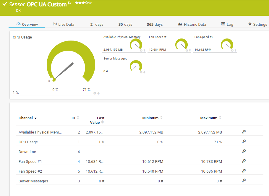 In the channel table on the Overview tab, this channel never shows any values. PRTG uses this channel in graphs and reports to show the amount of time in which the sensor was in the Down state
