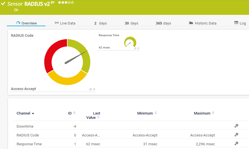In the channel table on the Overview tab, this channel never shows any values. PRTG uses this channel in graphs and reports to show the amount of time in which the sensor was in the Down state