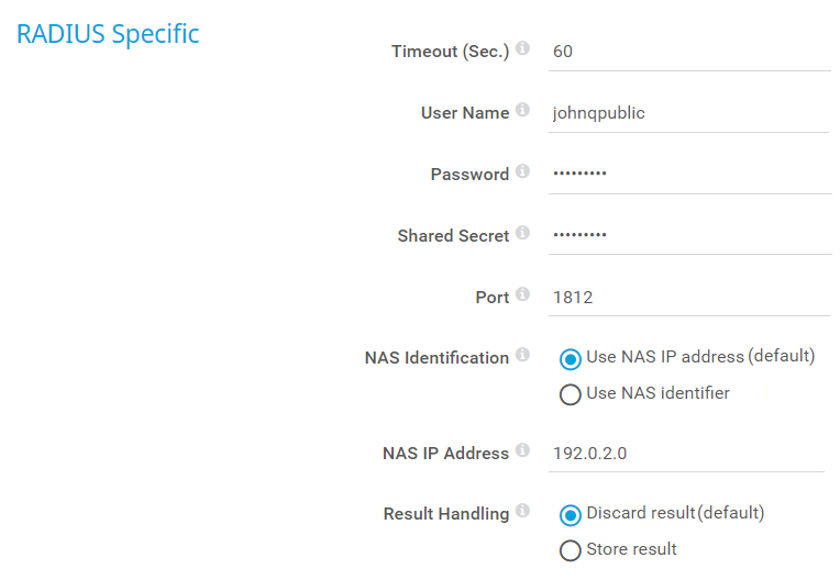 Enter the shared secret for the authentication between the authenticator (the probe system) and the RADIUS server. Enter a string.