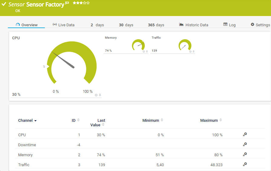 The channels of a Sensor Factory sensor are controlled by the Channel Definition text field. Using a special syntax, you can refer to other sensors' channels, calculate values, and add horizontal lines. You can define Sensor Factory channels using data from any other sensor's channels on your PRTG core server.