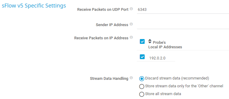 This sensor requires that the sFlow v5 export is enabled on the target system. The target system must send the flow data stream to the IP address of the probe system.
