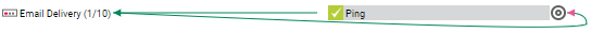 Green lines show a master dependency for a device (Master sensor for parent setting). The sensor that is set as the master points to the dependent device with a green arrow head at the line's end. The arrow head from the dependent device to its master sensor is pink.