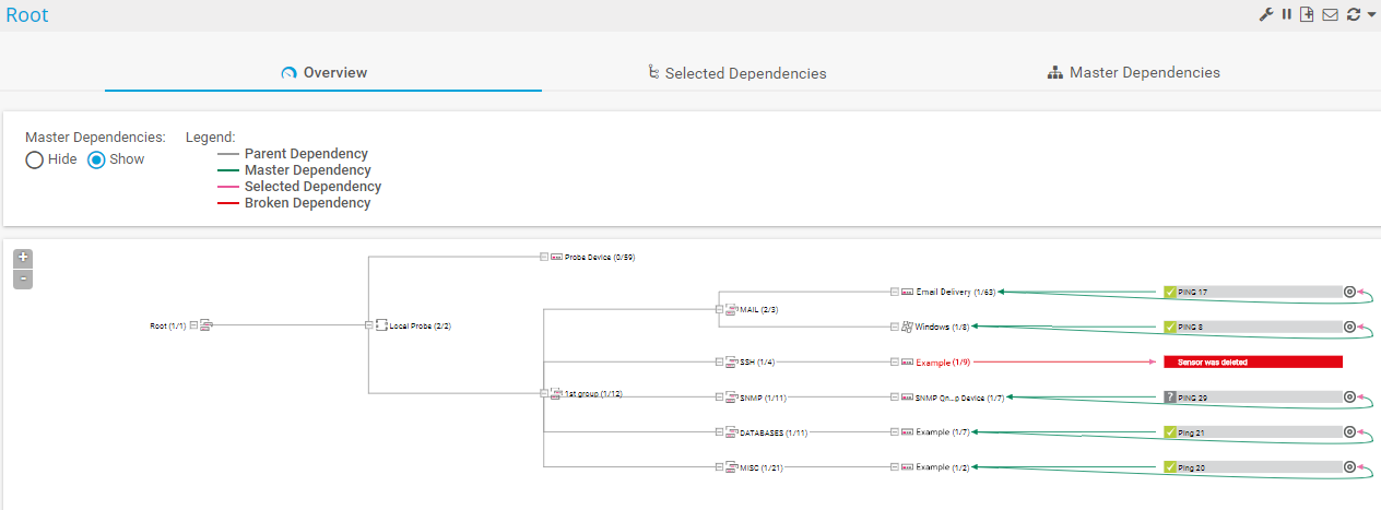 The Overview tab shows the device tree in the dependencies graph view. The lines in the dependencies graph symbolize dependencies between the monitoring objects in the device tree. Additionally, PRTG uses different line colors for the dependencies. You can also view the dependencies in different table lists on the Selected Dependencies tab or the Master Dependencies tab.