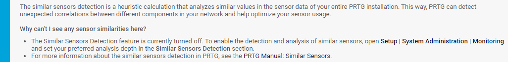 i_round_bluePRTG does not show the Similar Sensors section when the analysis is disabled or when you exceed 1,000 sensors and select the Manage automatically based on sensor count (recommended) option as Analysis Depth in the Monitoring settings. In this case, you see the following notice: