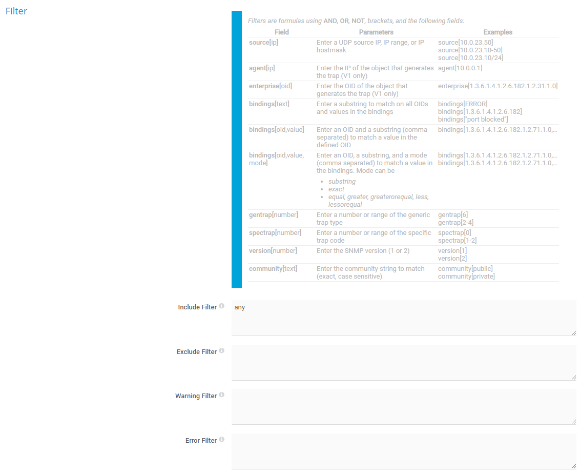 Define if you want to filter traps. If you leave this field empty or use the keyword any, the sensor processes all data. To include only specific types of traps, define filters using a special syntax.