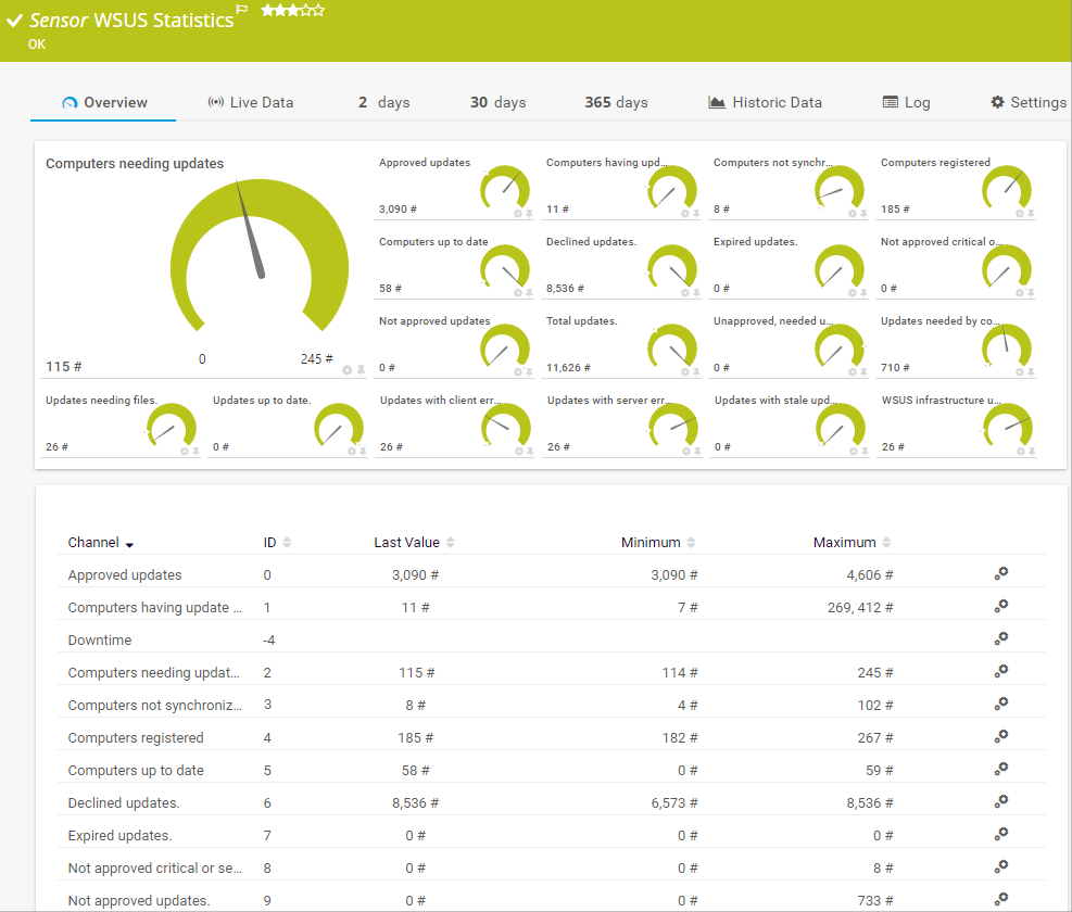 The WSUS Statistics sensor monitors various statistics on a Windows Server Update Services (WSUS) server via Windows Management Instrumentation (WMI).